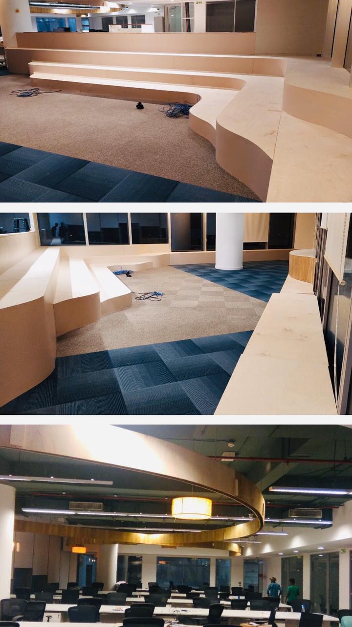 The Amphitheatre we have designed at the Hyperverge Office is getting ready! A curved window seat skirts along the glazed facade creating pockets of greenery along its course while coming to rest in a causal amphitheater style set-up. Smaller waves introduce greenery in this spine- that harbours the office and brings it together. There is no definite culmination as the curvilinear profiles are reflected in a custom designed light fixture the snakes it’s across the ceiling.