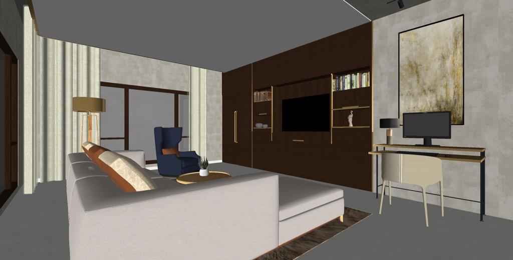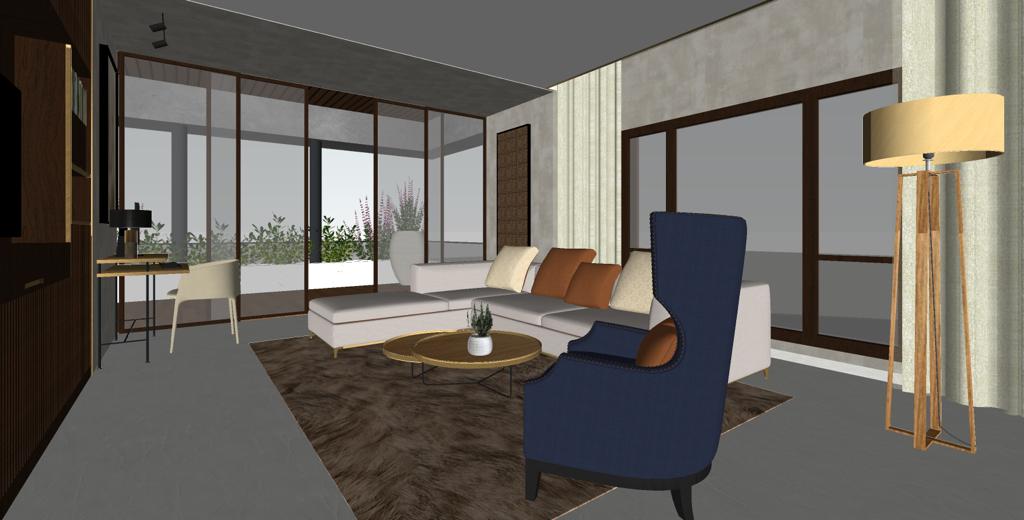 Located on the first floor of this residence which is predominantly vertical in its massing, the family space opens up to one of the balconies and offers privacy from the more social spaces below. A minimal palette of concrete and wood help the space visually transition into the balcony.