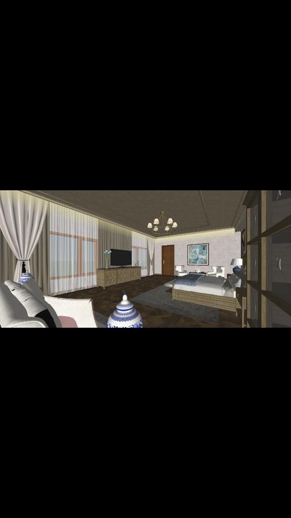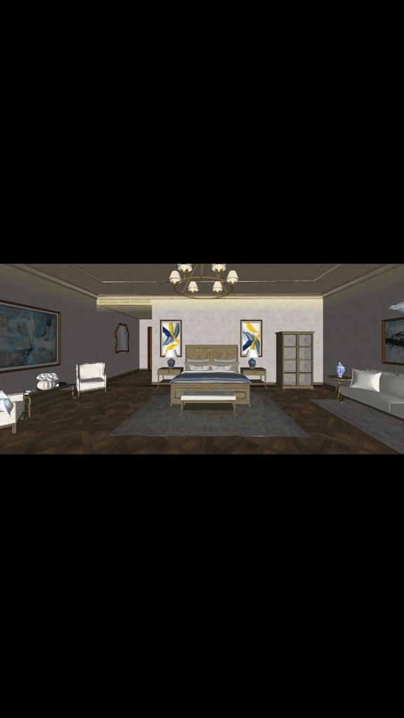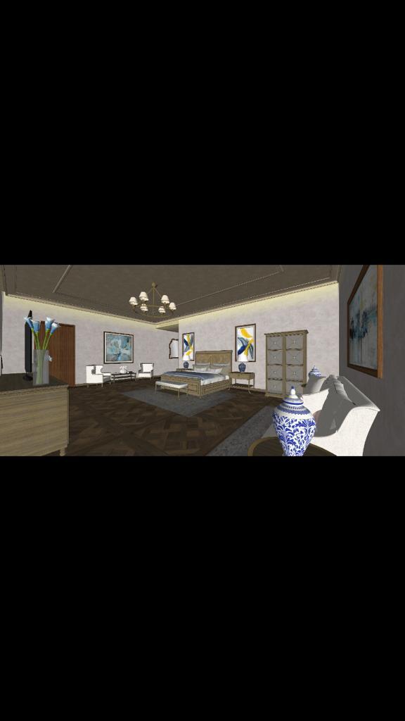 Modelled with Bernhardt inspired furniture; a SoHo luxe vibe, this farmhouse bedroom serves as a perfect mélange of East meets West. The European inspired Versailles Parquet floors are the perfect juxtaposition to the Oriental Accent Elements.
