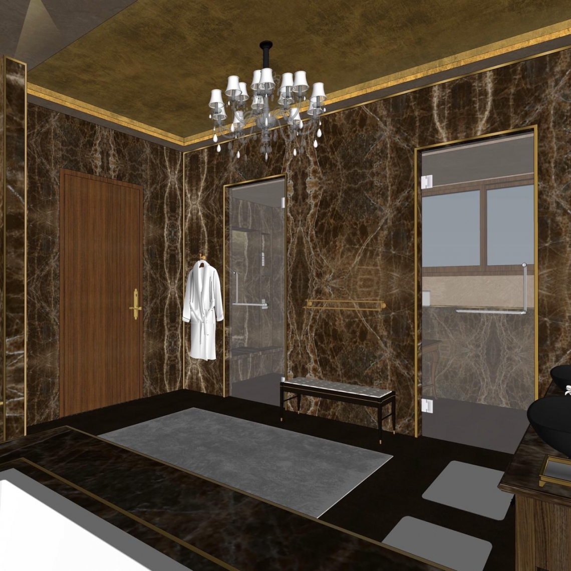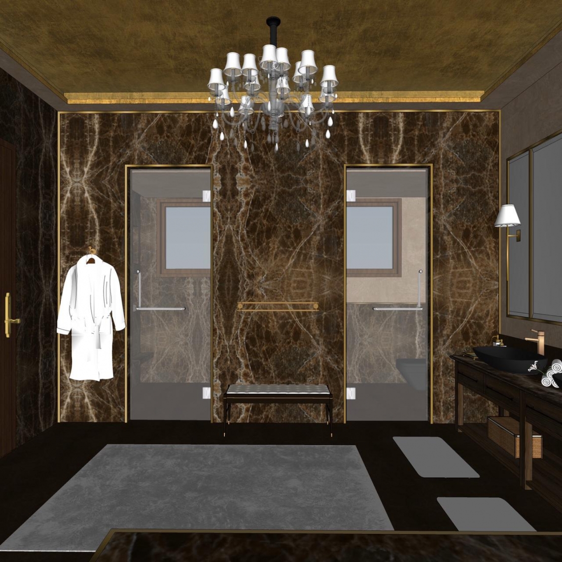 One of the Master Bathrooms uses dark brown onyx complemented with lustrous gold plaster and brass detailing; to embody a sense of warm luxury. This is further reinforced with high ceilings, wide portals, a chandelier and spacious enclosures.