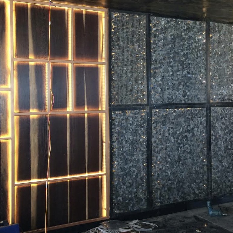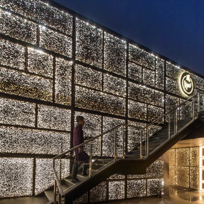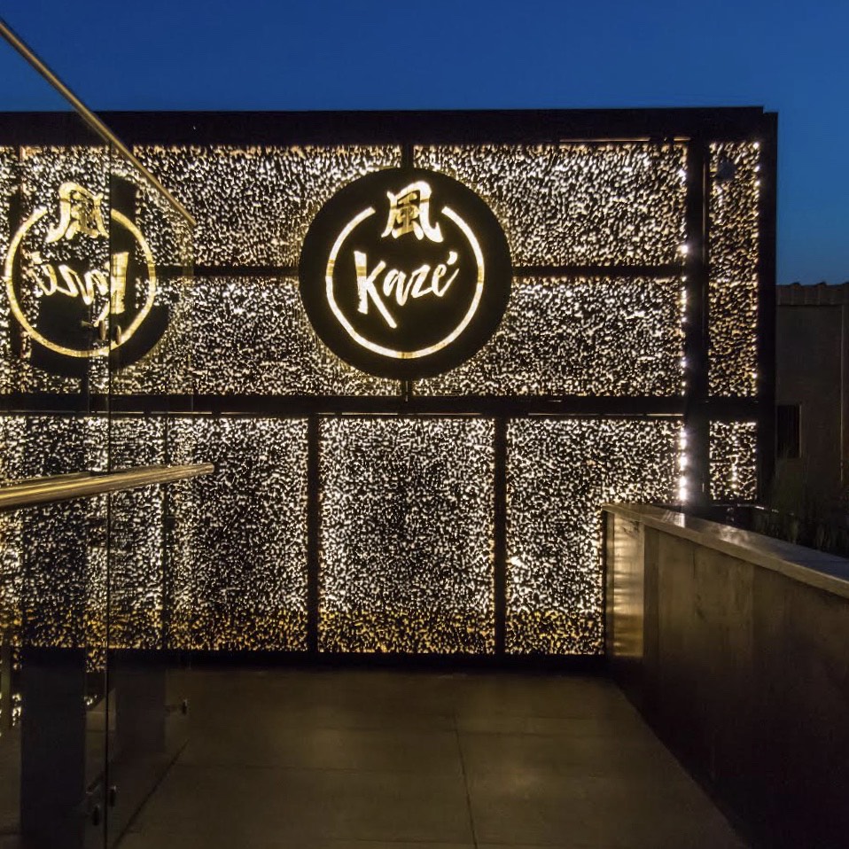 Gabions are baskets of galvanised steel wire filled with interlocking individual stones and rocks. They are economical and environment friendly as recycled materials can be placed into the gabion cage. Kaze features a decorative gabion element that allows light to pass through the gaps between the stones, making it an attractive feature wall to the restaurant.--