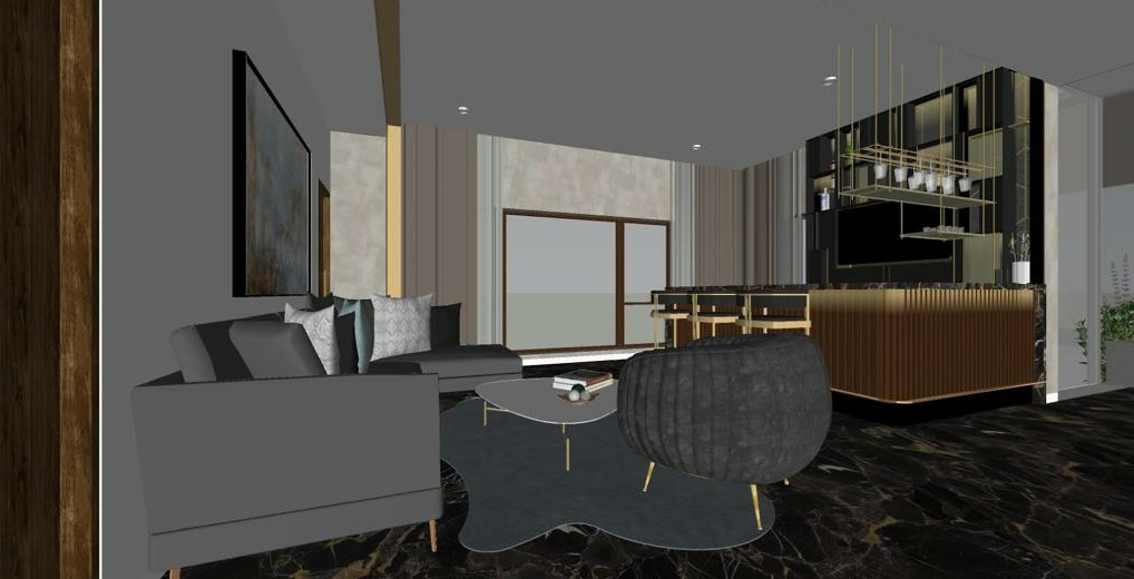 Jubilee Hills Residence Bar, A dark theme was chosen for this bar in order to create a stark contrast with the terrace lounge outside. The Marble floor and brass elements, the bar and the false ceiling formed the backdrop for the furniture piece.