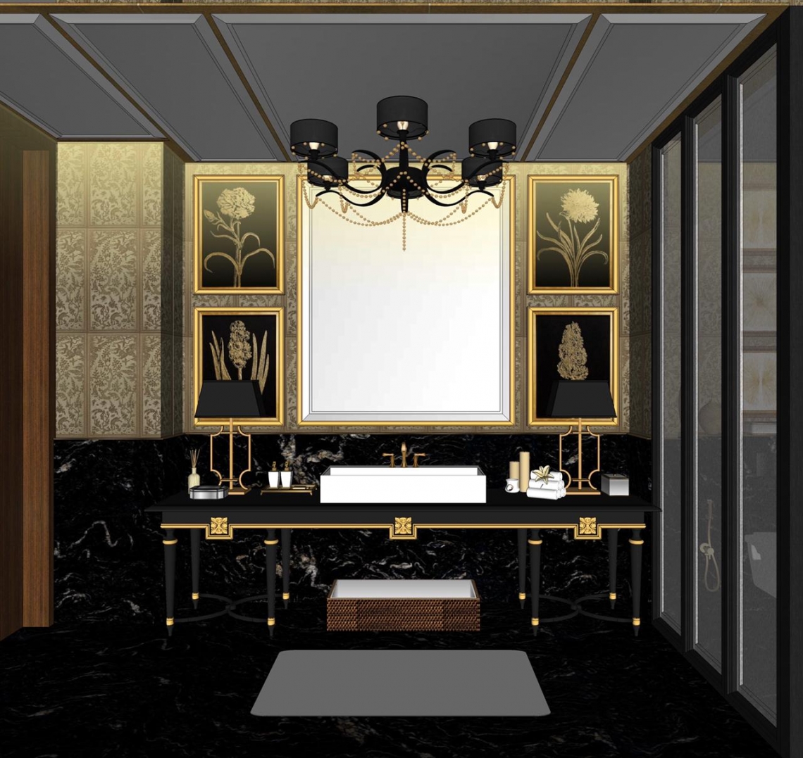 An initial 3D visualisation for a powder toilet at a luxury Farm House in Bangalore. We used a dark and reflective palette, mirrors on the ceiling, bold imagery and gold details compete against a richly patterned tile and titanium gold marble.