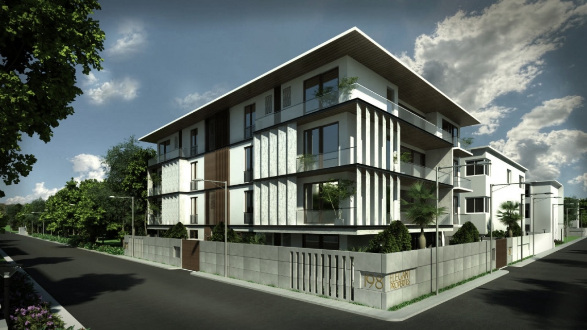 Slim stone fins over two floors act as a thermal barrier and further allows privacy for the lower floors. In terms of design language, the screen emphasizes the corner while unifying the massing.