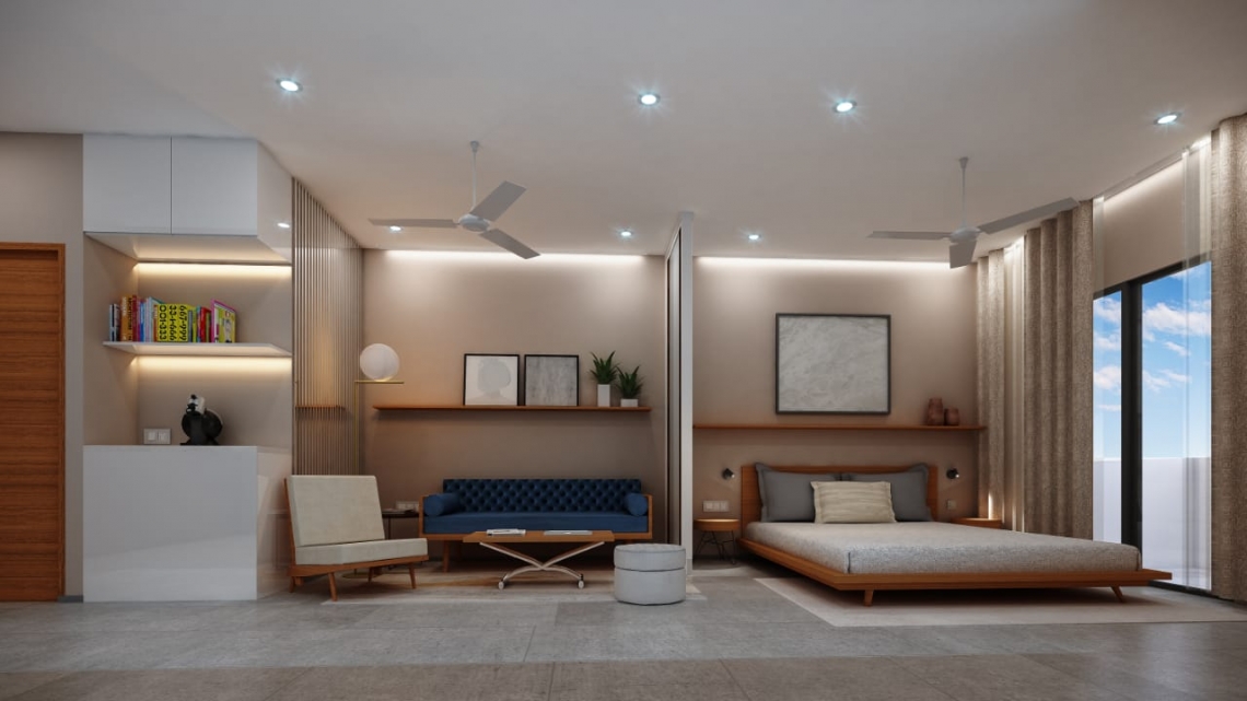 The project brief was to design a flexible studio apartment for young entrepreneurs and businessmen. In order to maximise space efficiency and utilisation, one of the longer walls of the rectangular plan was provided with a modular kitchen and wardrobe along with the main functions . The space was partitioned to offer privacy when necessary. The furniture was kept sleek and minimal. While lighter tones to the wall surfaces made the space large, the accents of wood and furniture pieces made it feel cosy.