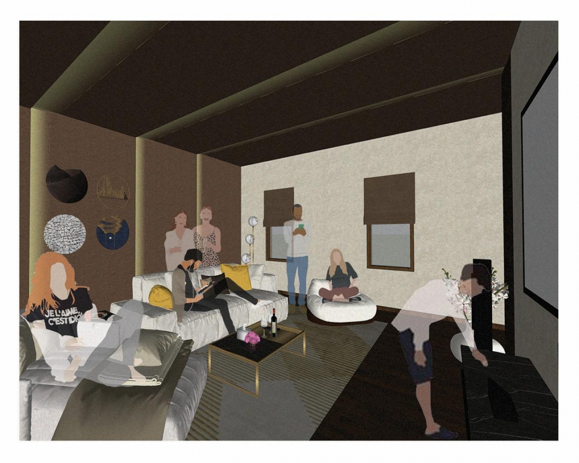 The TV Room. A recreational space , which becomes an important node for leisure activities like movie watching, family gathering and gaming.