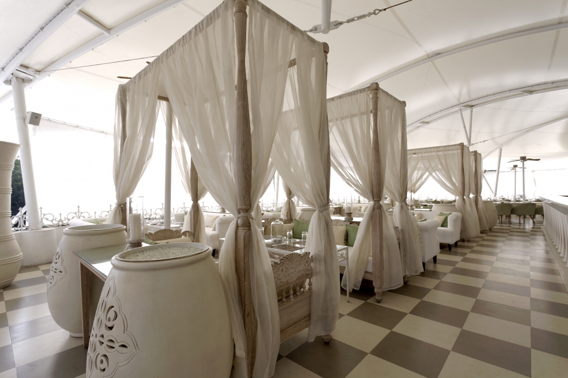 The restaurant intends to transport the diner into the bygone era of the aristocrats and nobles and their lifestyle and debauchery in the bye-gone era.The restaurant and bar is set on the first floor terrace space with a tensile roof cover and is open on one side to a beautiful lake view. The various elements in this restaurant take inspiration from the furniture, tapestry, imagery, decorations and the luxury of the bye-gone era to recreate that setting.