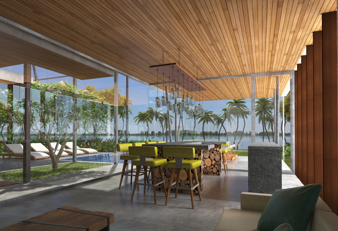 Description: A sprawling 25 Acre residential community located along the banks of Kabini River consists of 35 luxury villas, each with a spectacular view of the waterfront. The design of the Villa is inspired by South East Asian contemporary style of architecture, each with a private large landscaped garden space surrounding their villa that allows for private gatherings. All common spaces are organised around a linear courtyard that extends into a large invinity pool. A similar linear terrace deck on the upper floor, hovers partially above the pool and is visually linked to the waterfront along the axis.