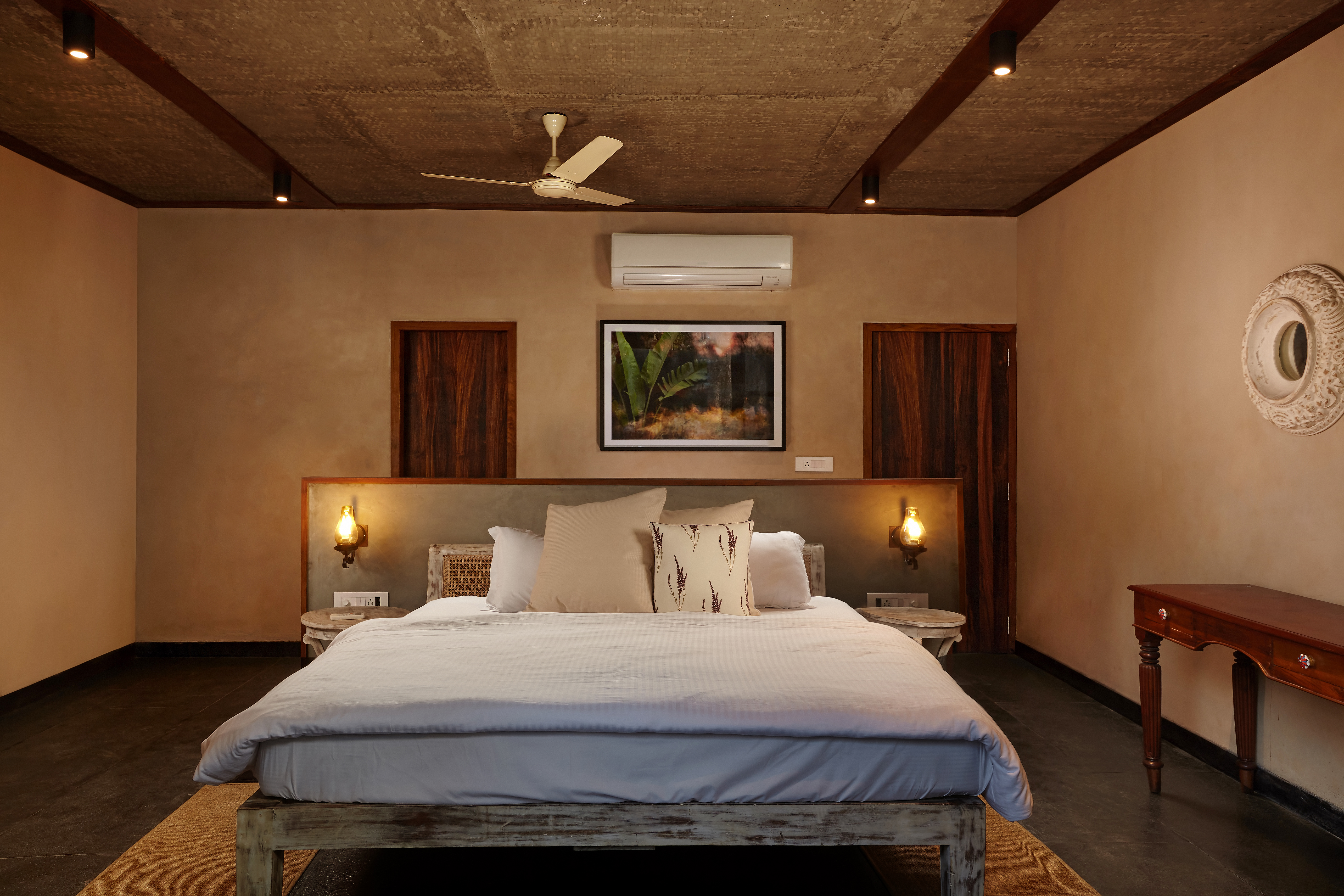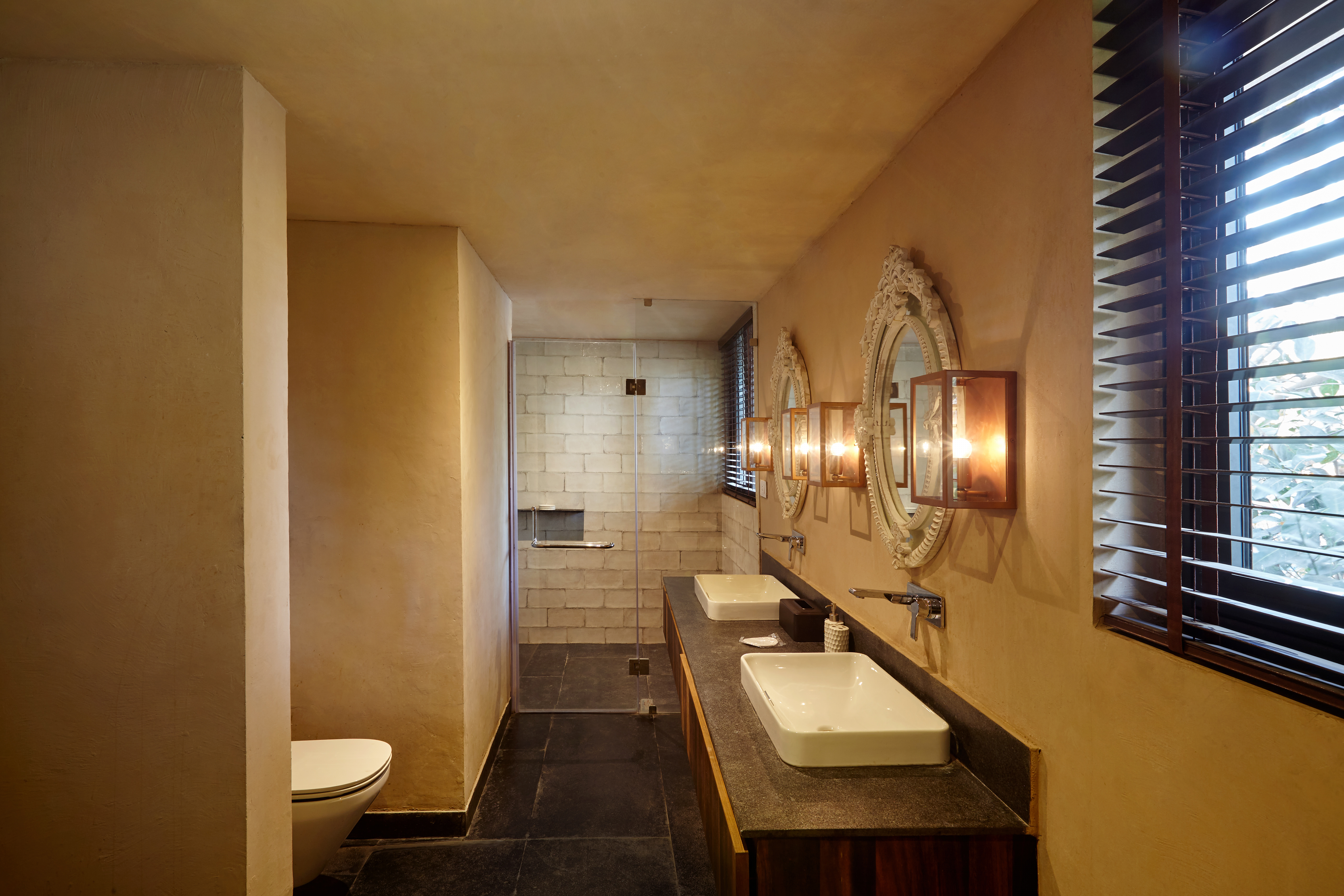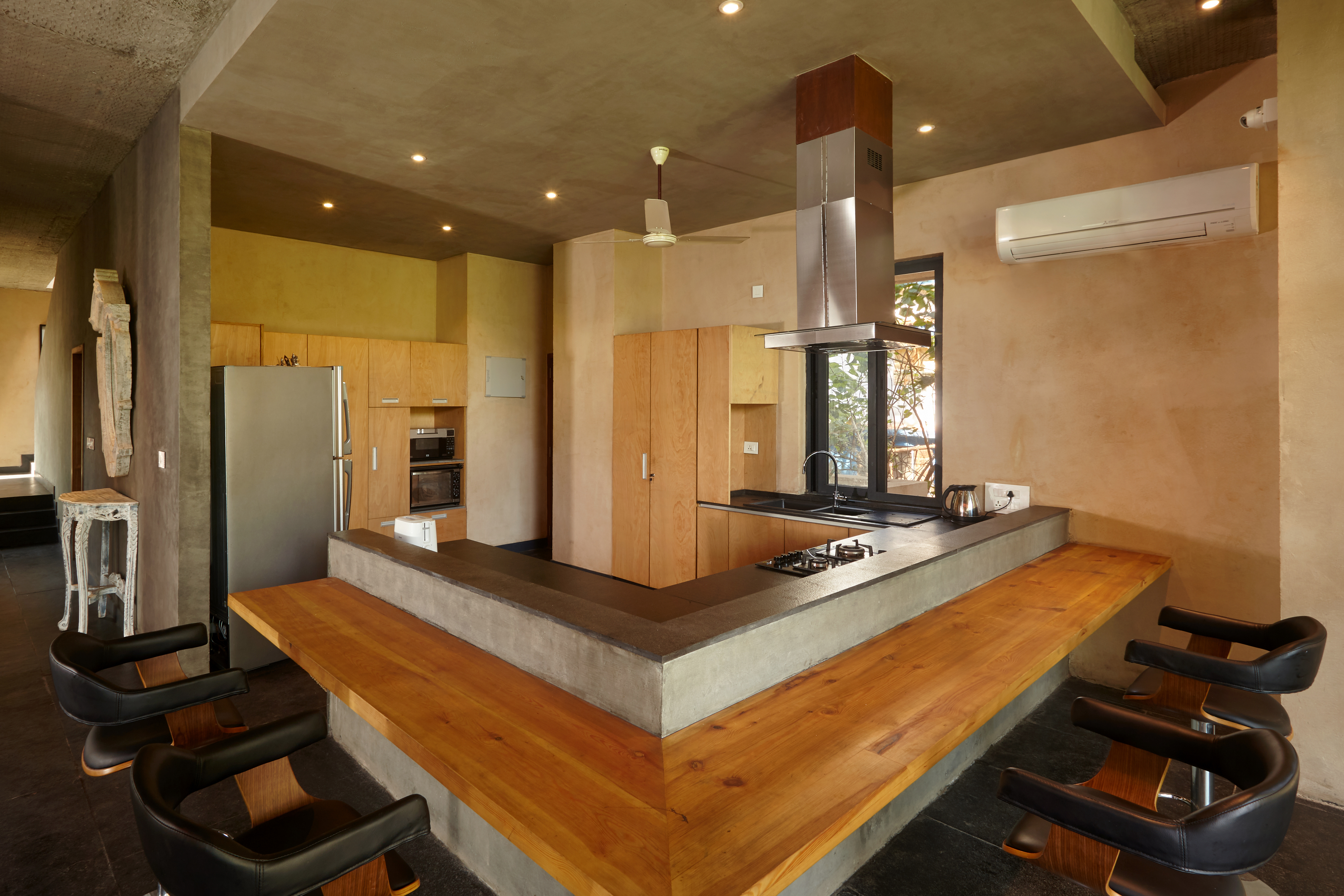 Levitating House gets its name from the seemingly floating volume of the Villa and stretches out towards the rear green fields. It is designed to heighten the experience of a get-away home meant for both relaxation and entertainment, built to cater to the requirements of the discerning inhabitants. The spaces are organised such that the living, lounging, entertaining and eating spaces all open out into the backyard with the pool as this space inherits the tropical landscape and hill in the horizon and connects the house visually with it. Two of the upper floor bedrooms look into this tropical expanse as well. Through the use of locally sourced laterite, Goan pigmented cement tiles, and local skilled craft like polished pigmented concrete flooring, the Villa harmonises with the environment and imbibes qualities of the Goan tradition.