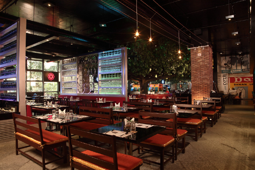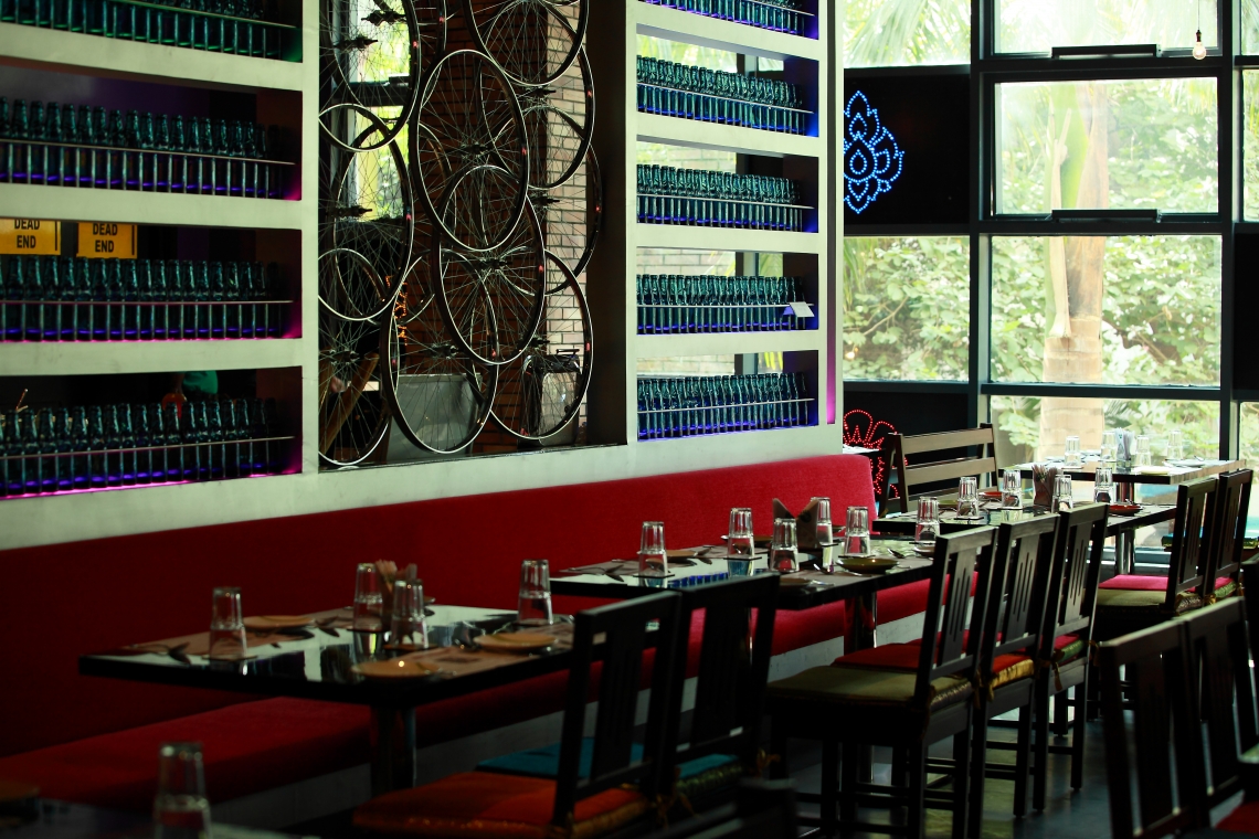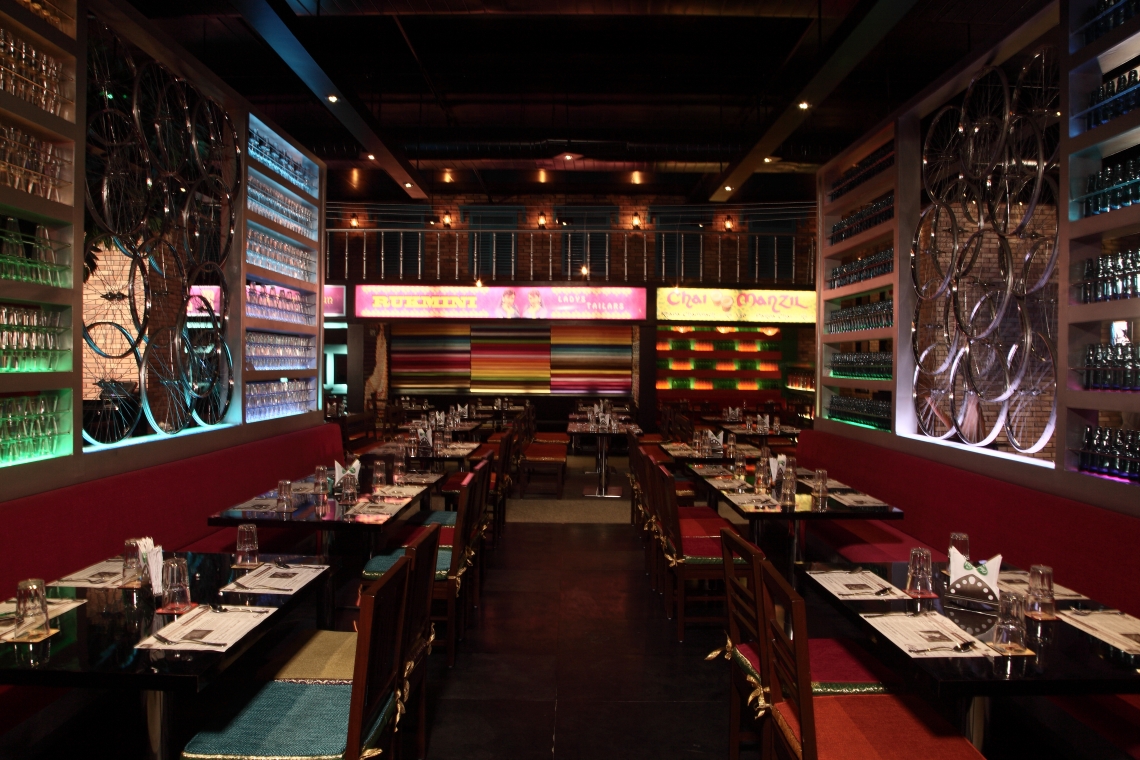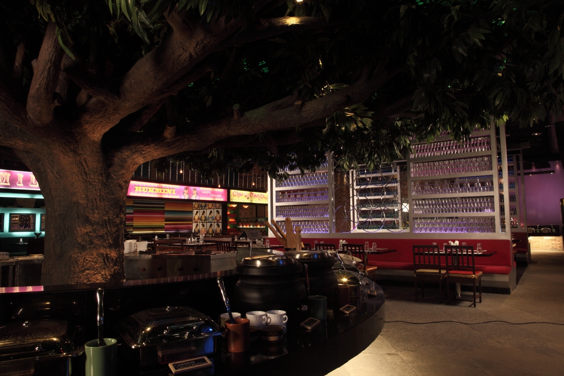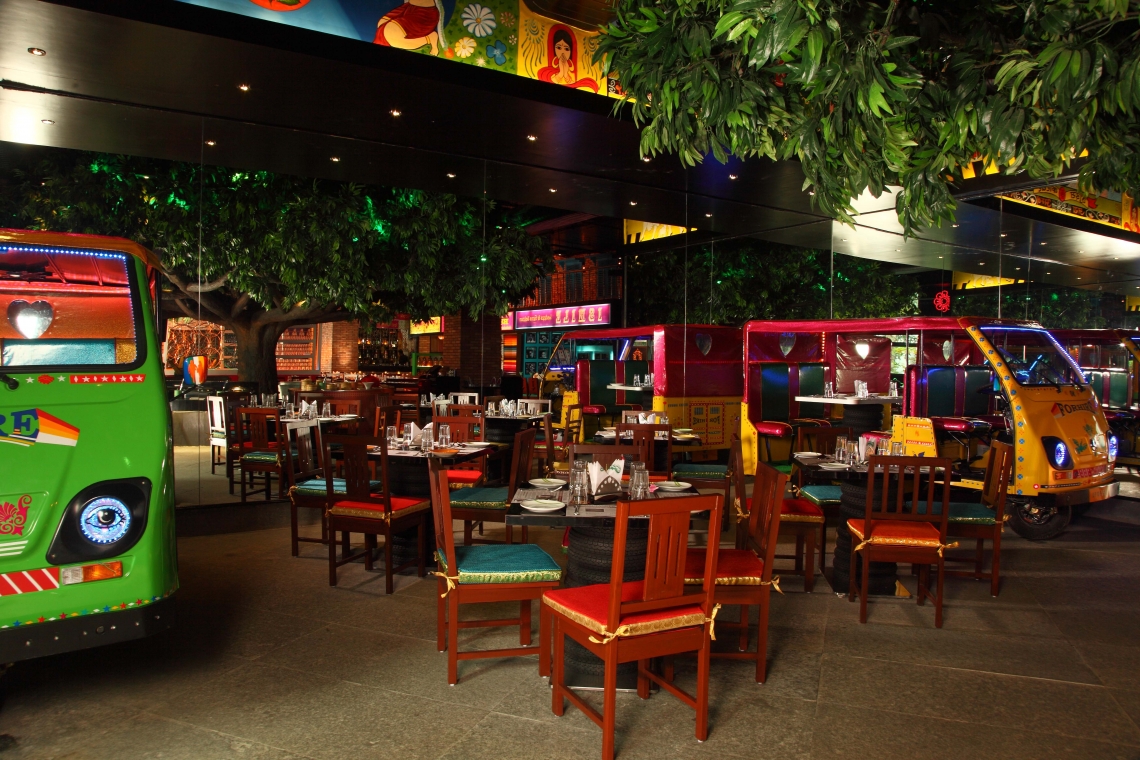 Nautanki Galli isnt just a restaurant. It is a journey through the quaint markets of India in all its glory, pomp and colour. It is fun, quirky and kitch. The visitor is greeted with a large tree flanked by auto rickshaws on both sides. The space opens beyond into series of streets adorned with road signs and street art and , reusing spare parts of cycles and signage.
