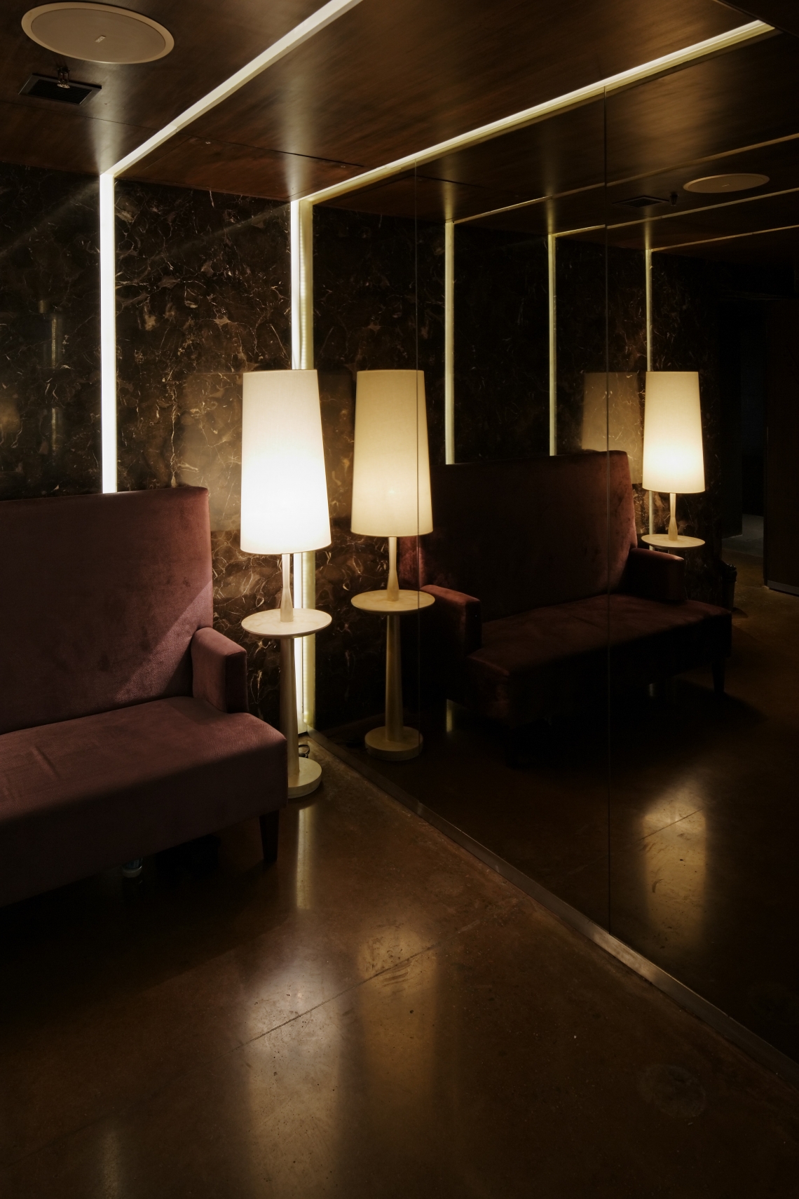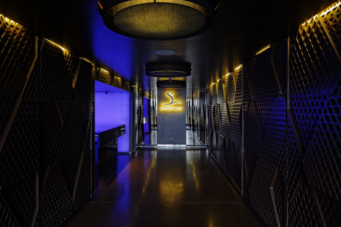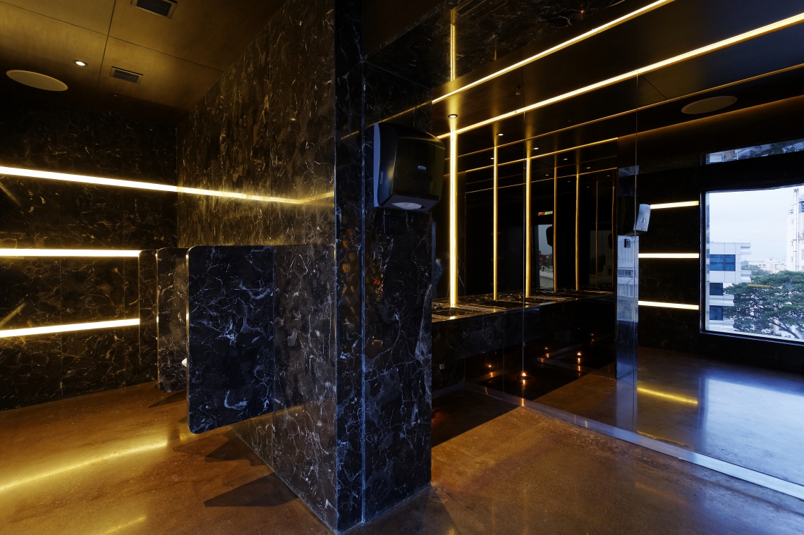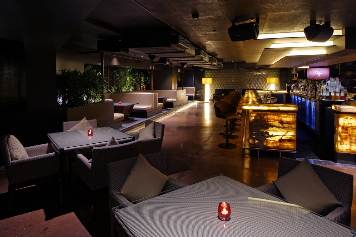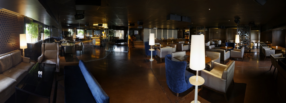 This private members club is located in the heart of the central business district area of Bangalore, India.Set on the third floor of a commercial building attached to a four star hotel, the club caters to an evolved clientele- be it in their thoughts, their way of life, taste for music, design, fashion or their prowess in the software domain. The space is accessed through a common building lobby on the ground floor through elevators that open into a Club Reception space that sets the mood for the what one is going to experience. Wooden and concrete trellises developed from converging lines that form triangular patterns function as either element that defines a space or a backdrop or both. These elements are meant to convey (in an abstract sense) different patterns that are formed when different people meet. The linear entrance foyer that greets the visitor straight from the elevator, gets one absorbed in the networking matrix that a metropolitan life today represents. The dramatic central glowing, Honey Onyx, island bar is the central precipice in the space that opens up to both the indoor space as well as the outdoor space.