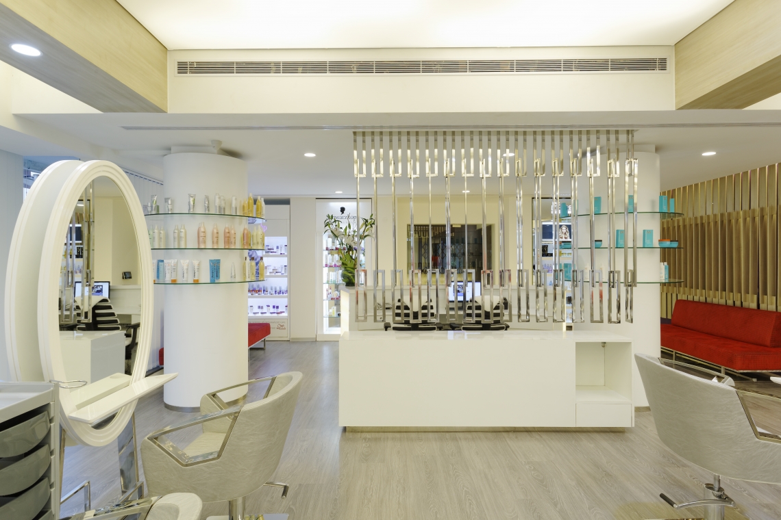 We needed to create a sense of openness within the limited area we had with all the many requirements given by the client. The site is rectangular with walls on three sides and glazing in the front. Hence, the enclosed spaces were kept along the peripheral rear side and the hair cutting stations were located centrally towards the front glazing.